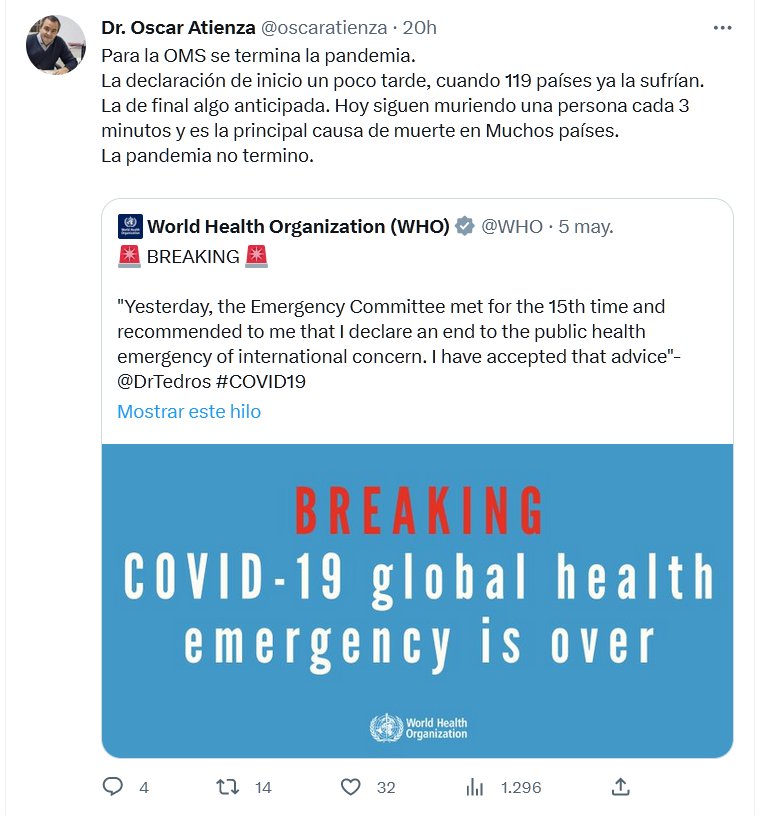 Dr. Oscar Atienza @oscaratienza · Para la OMS se termina la pandemia. La declaración de inicio un poco tarde, cuando 119 países ya la sufrían. La de final algo anticipada. Hoy siguen muriendo una persona cada 3 minutos y es la principal causa de muerte en Muchos países. La pandemia no termino.
