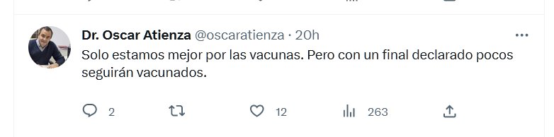 EL DOBLEMENSAJISMO ES UN CRIMEN Dr. Oscar Atienza @oscaratienza · 20h Solo estamos mejor por las vacunas. Pero con un final declarado pocos seguirán vacunados. Posted on mayo 6, 2023 por coronado https://twitter.com/oscaratienza/status/1654559131016019968