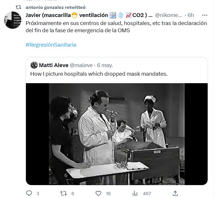 SARCASMO, IRONÍA, BURLA Próximamente en sus centros de salud, hospitales, etc tras la declaración del fin de la fase de emergencia de la OMS Posted on mayo 8, 2023 por coronado https://twitter.com/i/status/1654911925413658624