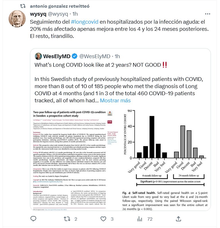Seguimiento del #longcovid en hospitalizados por la infección aguda: el 20% más afectado apenas mejora entre los 4 y los 24 meses posteriores. El resto, tirandillo. Posted on mayo 8, 2023 por coronado
