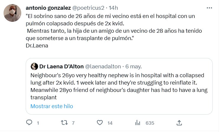 TESTIMONIOS «El sobrino sano de 26 años de mi vecino está en el hospital con un pulmón colapsado después de 2x kvid. Mientras tanto, la hija de un amigo de un vecino de 28 años ha tenido que someterse a un trasplante de pulmón.» Dr.Laena
