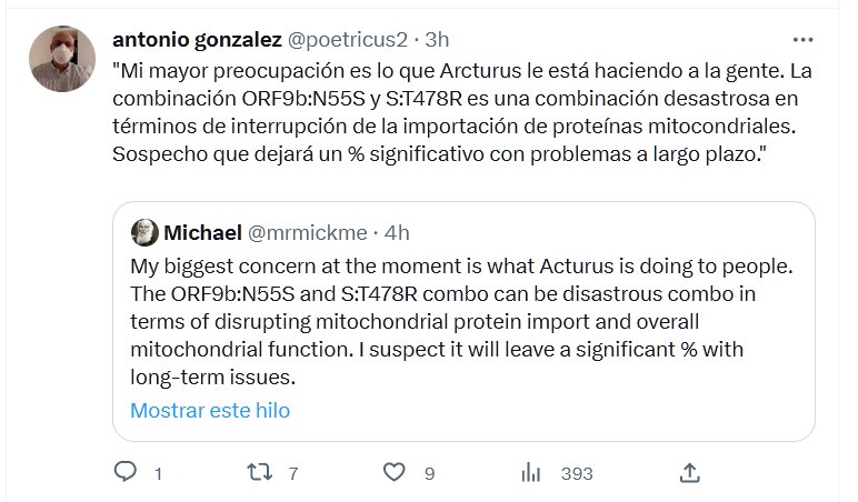 «Mi mayor preocupación es lo que Arcturus le está haciendo a la gente. La combinación ORF9b:N55S y S:T478R es una combinación desastrosa en términos de interrupción de la importación de proteínas mitocondriales. Sospecho que dejará un % significativo con problemas a largo plazo.»