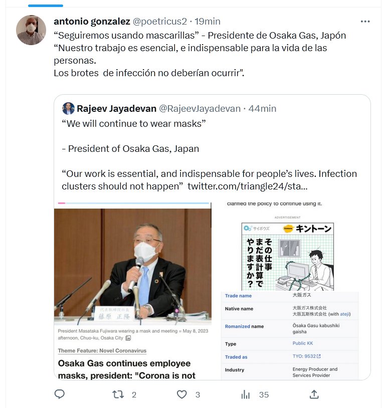 “Seguiremos usando mascarillas” – Presidente de Osaka Gas, Japón “Nuestro trabajo es esencial, e indispensable para la vida de las personas. Los brotes de infección no deberían ocurrir». Posted on mayo 9, 2023 por coronado