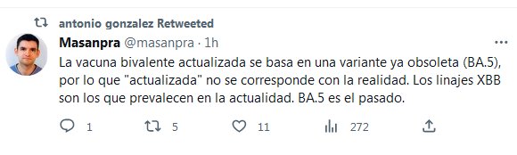 La vacuna bivalente actualizada se basa en una variante ya obsoleta (BA.5), por lo que «actualizada» no se corresponde con la realidad. Los linajes XBB son los que prevalecen en la actualidad. BA.5 es el pasado.