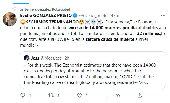 (…………….) SIN PALABRAS! 😳SEGUIMOS TERMINANDO😳☠️💀☠️« Esta semana,The Economist estima que ha habido un exceso de 14.000 muertes por día atribuibles a la pandemia,mientras que el total acumulado asciende ahora a 22 millones,lo que convierte a la COVID-19 en la tercera causa de muerte a nivel mundial»