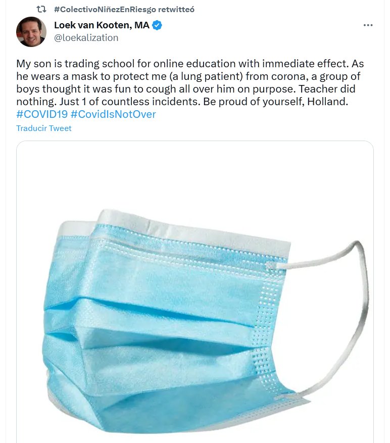 TESTIMONIOS (EN INGLÉS) Mi hijo cambiará la escuela por educación en línea con efecto inmediato. Como usa una máscara para protegerme a mí (un paciente pulmonar) de la corona, un grupo de niños pensó que era divertido toser sobre él a propósito. El maestro no hizo nada. Solo 1 de innumerables incidentes. Siéntete orgulloso de ti mismo, Holanda
