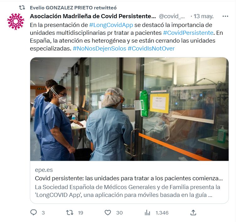 Asociación Madrileña de Covid Persistente- AMACOP @covid_madrid · 13 may. En la presentación de #LongCovidApp se destacó la importancia de unidades multidisciplinarias pr tratar a pacientes #CovidPersistente. En España, la atención es heterogénea y se están cerrando las unidades especializadas. #NoNosDejenSolos #CovidIsNotOver