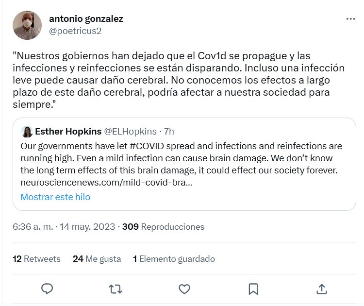 EN INGLÉS «Nuestros gobiernos han dejado que el Cov1d se propague y las infecciones y reinfecciones se están disparando. Incluso una infección leve puede causar daño cerebral. No conocemos los efectos a largo plazo de este daño cerebral, podría afectar a nuestra sociedad para siempre.»