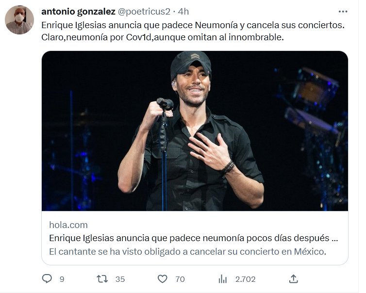 «NOCOVID» HACE ESTRAGOS Enrique Iglesias anuncia que padece Neumonía y cancela sus conciertos. Claro,neumonía por Cov1d,aunque omitan al innombrable. Posted on mayo 14, 2023 por coronado