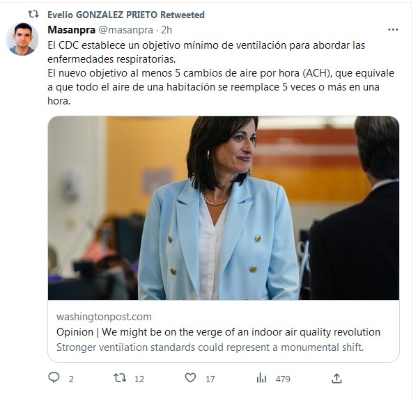 El CDC establece un objetivo mínimo de ventilación para abordar las enfermedades respiratorias. El nuevo objetivo al menos 5 cambios de aire por hora (ACH), que equivale a que todo el aire de una habitación se reemplace 5 veces o más en una hora.