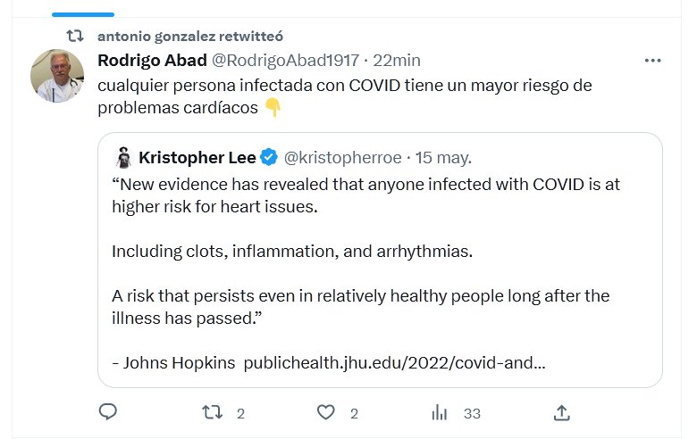 “Nueva evidencia ha revelado que cualquier persona infectada con COVID tiene un mayor riesgo de problemas cardíacos. Incluyendo coágulos, inflamación y arritmias. Un riesgo que persiste incluso en personas relativamente sanas mucho después de que la enfermedad haya pasado”. - Johns Hopkins...