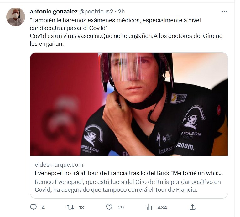 Evenepoel no irá al Tour de Francia tras lo del Giro «También le haremos exámenes médicos, especialmente a nivel cardíaco,tras pasar el Cov1d» Cov1d es un virus vascular. Que no te engañen. A los doctores del Giro no les engañan.