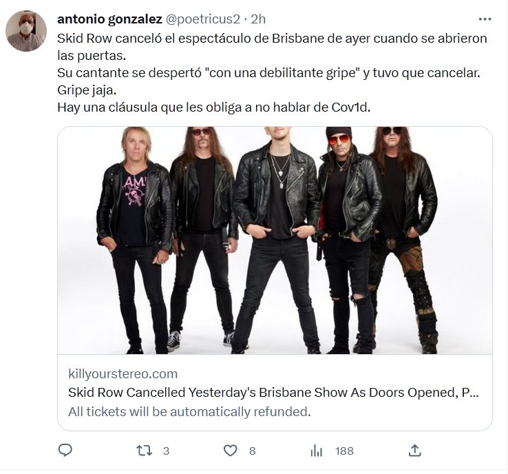 LA LEY DE OMERTÁ POR CONTRATO? Skid Row canceló el espectáculo de Brisbane de ayer cuando se abrieron las puertas. Su cantante se despertó «con una debilitante gripe» y tuvo que cancelar. Gripe jaja. Hay una cláusula que les obliga a no hablar de Cov1d.