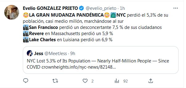 😳LA GRAN MUDANZA PANDÉMICA😳🗽NYC perdió el 5,3% de su población, casi medio millón, marchándose al sur 🏙️San Francisco perdió un desconcertante 7,5 % de sus ciudadanos 🏙️Revere en Massachusetts perdió un 5,9 % 🏙️Lake Charles en Luisiana perdió un 6,9 %