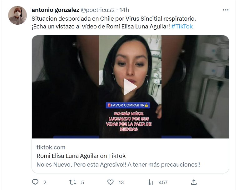 POSTCOVID HACE ESTRAGOS Situacion desbordada en Chile por Virus Sincitial respiratorio. ¡Echa un vistazo al vídeo de Romi Elisa Luna Aguilar! #TikTok Posted on mayo 20, 2023 por coronado https://www.tiktok.com/@romilunaagui/video/7234297771371662597?_r=1&_t=8cScQBQ3ezD