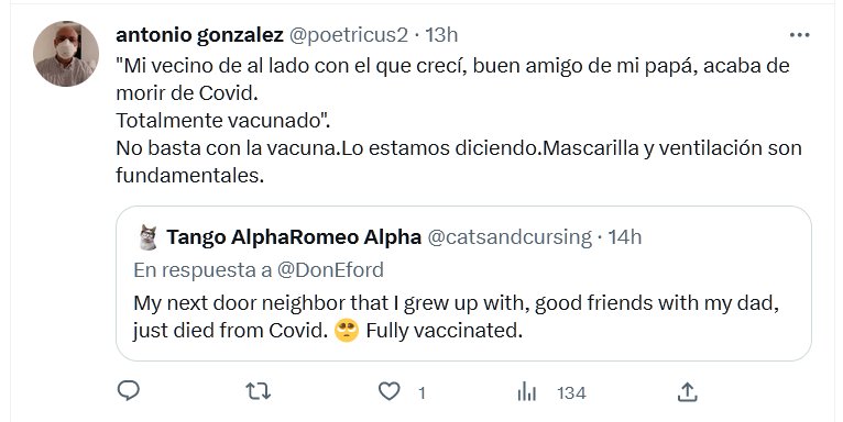 TESTIMONIOS «Mi vecino de al lado con el que crecí, buen amigo de mi papá, acaba de morir de Covid. Totalmente vacunado». No basta con la vacuna.Lo estamos diciendo.Mascarilla y ventilación son fundamentales.