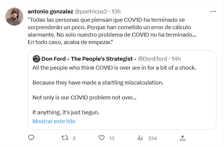 «Todas las personas que piensan que COV1D ha terminado se sorprenderán un poco. Porque han cometido un error de cálculo alarmante. No solo nuestro problema de COVID no ha terminado… En todo caso, acaba de empezar.»