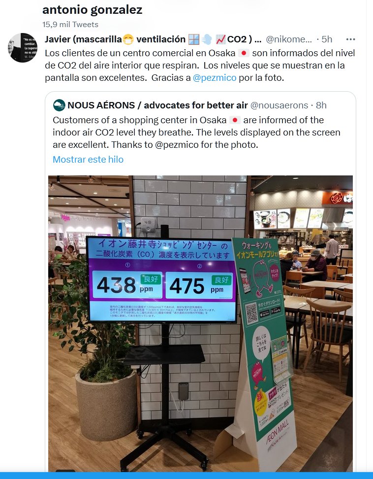 FUTURO IMPERFECTO Javier (mascarilla😷 ventilación 🪟💨 📈CO2 ) 🚫🦠 @nikomer75 · Los clientes de un centro comercial en Osaka 🇯🇵 son informados del nivel de CO2 del aire interior que respiran. Los niveles que se muestran en la pantalla son excelentes