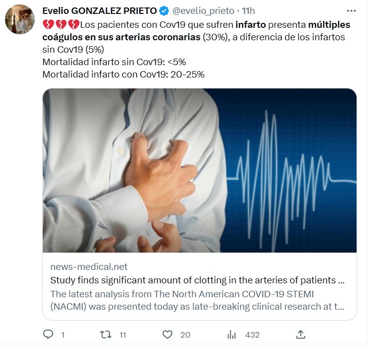 LA LETALIDAD DE INFARTO PASÓ DE 5 HASTA 25% POR COVID 💔💔💔Los pacientes con Cov19 que sufren infarto presenta múltiples coágulos en sus arterias coronarias (30%), a diferencia de los infartos sin Cov19 (5%) Mortalidad infarto sin Cov19: <5% Mortalidad infarto con Cov19: 20-25%