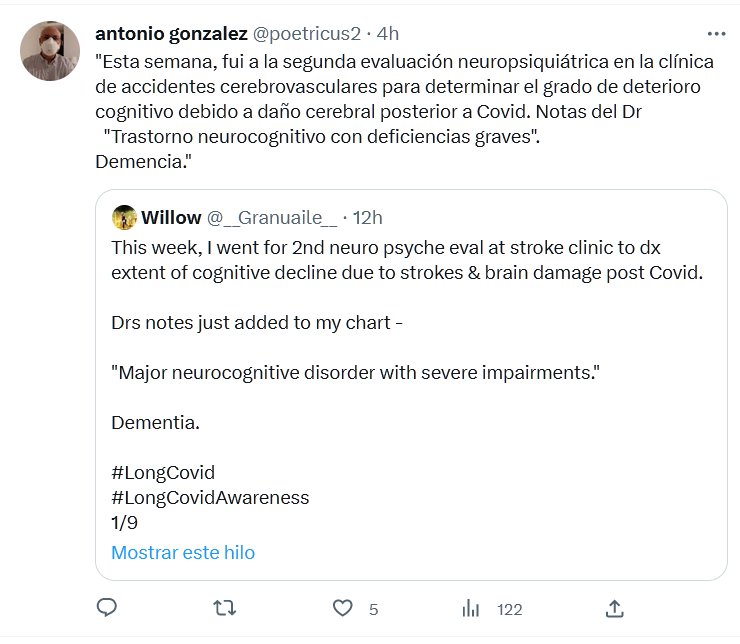 TESTIMONIOS «Esta semana, fui a la segunda evaluación neuropsiquiátrica en la clínica de accidentes cerebrovasculares para determinar el grado de deterioro cognitivo debido a daño cerebral posterior a Covid. Notas del Dr «Trastorno neurocognitivo con deficiencias graves». Demencia.»