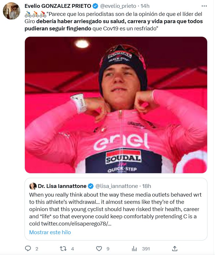 🚴♂️🚴🚴♀️»Parece que los periodistas son de la opinión de que el líder del Giro debería haber arriesgado su salud, carrera y vida para que todos pudieran seguir fingiendo que Cov19 es un resfriado»