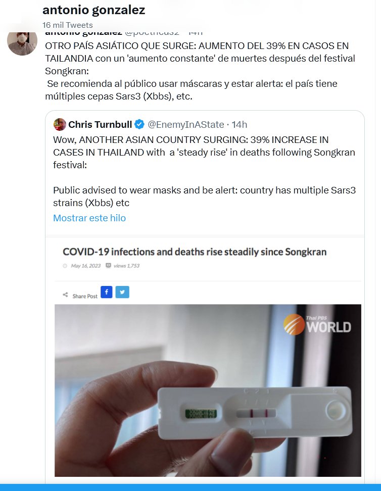 OTRO PAÍS ASIÁTICO QUE SURGE: AUMENTO DEL 39% EN CASOS EN TAILANDIA con un ‘aumento constante’ de muertes después del festival Songkran: Se recomienda al público usar máscaras y estar alerta: el país tiene múltiples cepas Sars3 (Xbbs), etc.