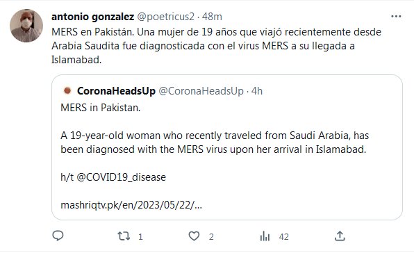 PARAPANDEMIA-SS MERS en Pakistán. Una mujer de 19 años que viajó recientemente desde Arabia Saudita fue diagnosticada con el virus MERS a su llegada a Islamabad. Posted on mayo 22, 2023 por coronado