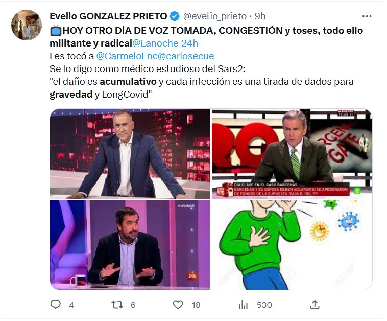 📺HOY OTRO DÍA DE VOZ TOMADA, CONGESTIÓN y toses, todo ello militante y radical@Lanoche_24h Les tocó a @CarmeloEnc @carlosecue Se lo digo como médico estudioso del Sars2: «el daño es acumulativo y cada infección es una tirada de dados para gravedad y LongCovid»