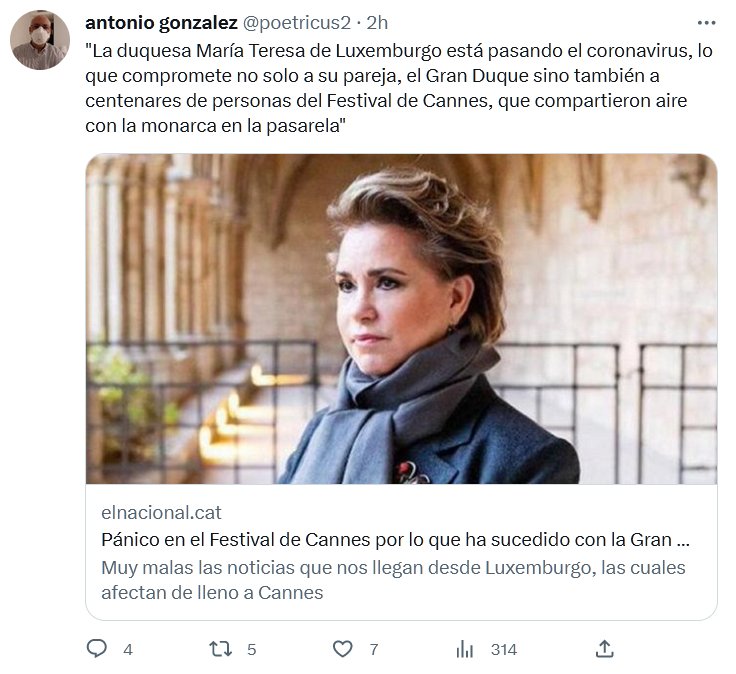 COVID ES REAL «La duquesa María Teresa de Luxemburgo está pasando el coronavirus, lo que compromete no solo a su pareja, el Gran Duque sino también a centenares de personas del Festival de Cannes, que compartieron aire con la monarca en la pasarela»