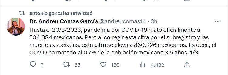 LA ÚNICA VERDAD ES LA REALIDAD Hasta el 20/5/2023, pandemia por COVID-19 mató oficialmente a 334,084 mexicanos. Pero al corregir esta cifra por el subregistro y las muertes asociadas, esta cifra se eleva a 860,226 mexicanos. Es decir, el COVID ha matado al 0.7% de la población mexicana 3.5 años
