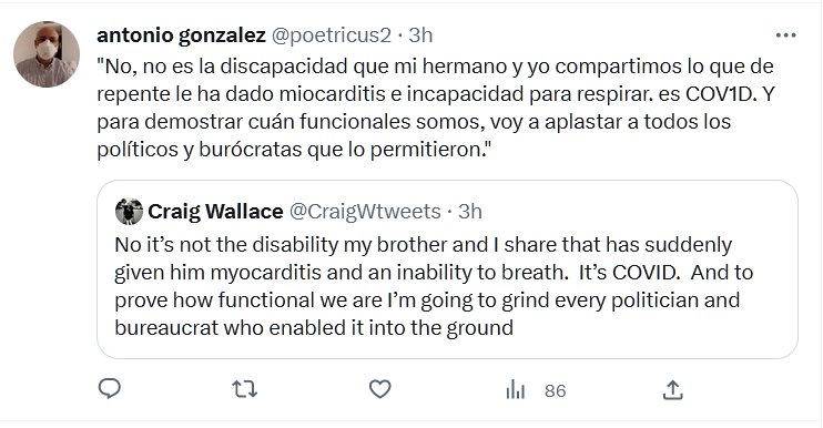 TESTIMONIOS «No, no es la discapacidad que mi hermano y yo compartimos lo que de repente le ha dado miocarditis e incapacidad para respirar. es COV1D. Y para demostrar cuán funcionales somos, voy a aplastar a todos los políticos y burócratas que lo permitieron.»
