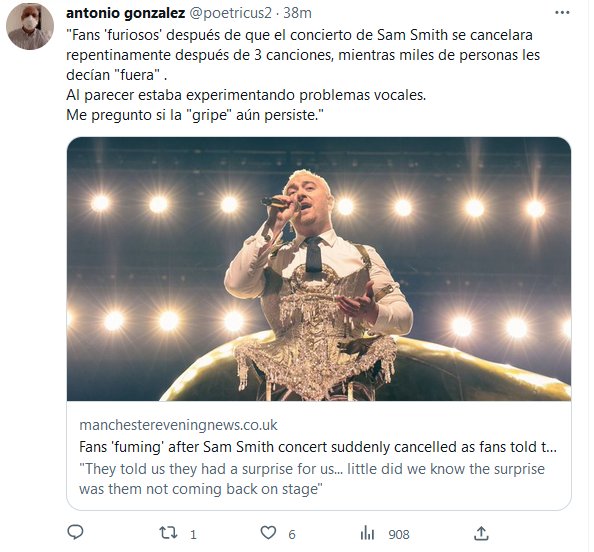 «NOCOVID» GRIPECITA HACE ESTRAGOS «Fans ‘furiosos’ después de que el concierto de Sam Smith se cancelara repentinamente después de 3 canciones, mientras miles de personas les decían «fuera» . Al parecer estaba experimentando problemas vocales. Me pregunto si la «gripe» aún persiste.»