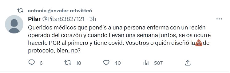 Queridos médicos que ponéis a una persona enferma con un recién operado del corazón y cuando llevan una semana juntos, se os ocurre hacerle PCR al primero y tiene covid. Vosotros o quién diseñó la 💩 (MIERDA) de protocolo, bien, no?