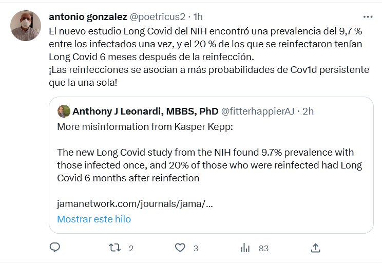 NO TE REINFECTES! El nuevo estudio Long Covid del NIH encontró una prevalencia del 9,7 % entre los infectados una vez, y el 20 % de los que se reinfectaron tenían Long Covid 6 meses después de la reinfección. ¡Las reinfecciones se asocian a más probabilidades de Covid persistente que la una sola!