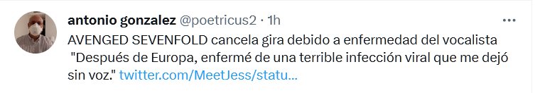 AVENGED SEVENFOLD cancela gira debido a enfermedad del vocalista «Después de Europa, enfermé de una terrible infección viral que me dejó sin voz.» Posted on mayo 27, 2023 por coronado https://twitter.com/MeetJess/status/1662422333540249600