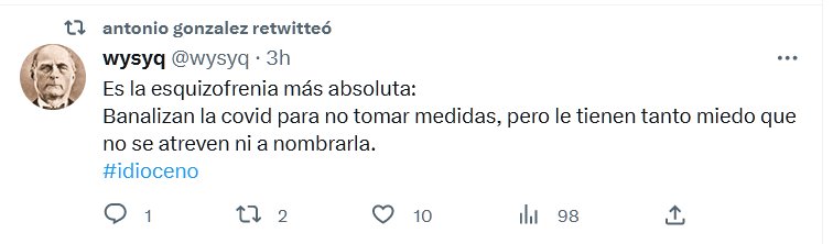 Es la esquizofrenia más absoluta: Banalizan la covid para no tomar medidas, pero le tienen tanto miedo que no se atreven ni a nombrarla. #idioceno Posted on mayo 27, 2023 por coronado