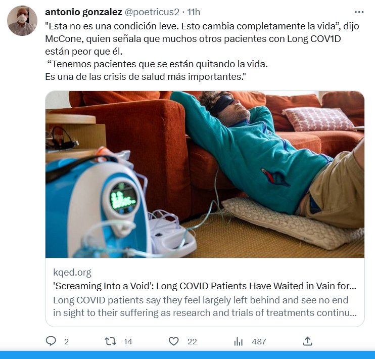 «Esta no es una condición leve. Esto cambia completamente la vida”, dijo McCone, quien señala que muchos otros pacientes con Long COV1D están peor que él. “Tenemos pacientes que se están quitando la vida. Es una de las crisis de salud más importantes.»