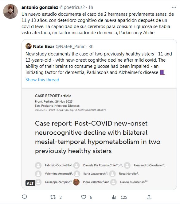 LESA HUMANIDAD Un nuevo estudio documenta el caso de 2 hermanas previamente sanas, de 11 y 13 años, con deterioro cognitivo de nueva aparición después de un covid leve. La capacidad de sus cerebros para consumir glucosa se había visto afectada, un factor iniciador de demencia, Parkinson y Alzheimer