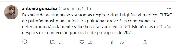 TESTIMONIOS Después de acusar nuevos síntomas respiratorios, Luigi fue al médico. El TAC de pulmón mostró una infección pulmonar grave. Sus condiciones se deterioraron rápidamente y fue hospitalizado en la UCI. Murió más de 1 año después de su infección por covid de principios de 2021.