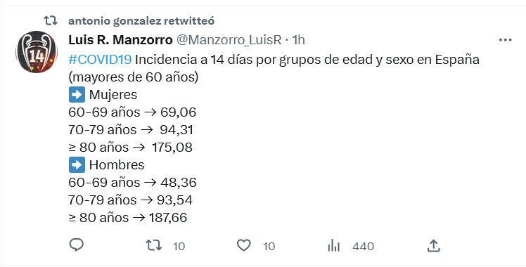 #COVID19 Incidencia a 14 días por grupos de edad y sexo en España (mayores de 60 años) ➡️ Mujeres 60-69 años → 69,06 70-79 años → 94,31 ≥ 80 años → 175,08 ➡️ Hombres 60-69 años → 48,36 70-79 años → 93,54 ≥ 80 años → 187,66