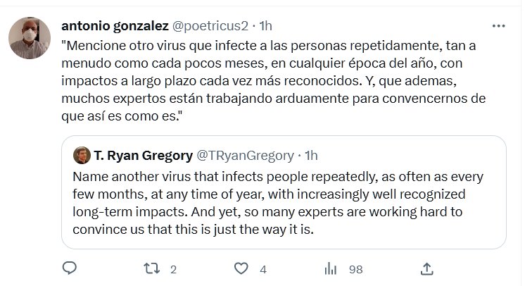 PROFESOR T. Ryan Gregory @TRyanGregory «Mencione otro virus que infecte a las personas repetidamente, tan a menudo como cada pocos meses, en cualquier época del año, con impactos a largo plazo cada vez más reconocidos. Y, que ademas, muchos expertos están trabajando arduamente para convencernos de que así es como es.»