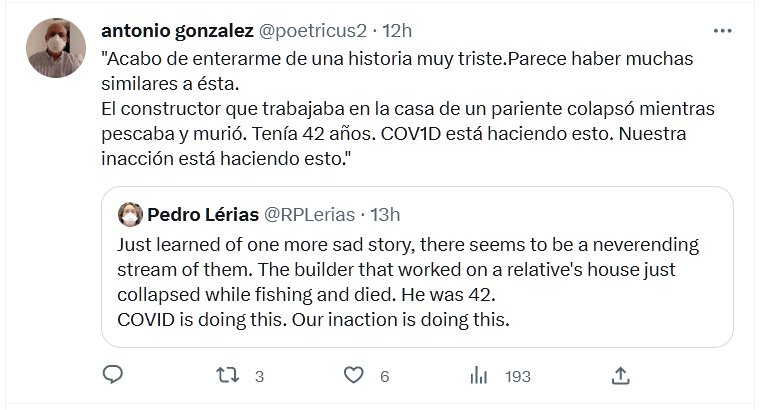 TESTIMONIOS «Acabo de enterarme de una historia muy triste.Parece haber muchas similares a ésta. El constructor que trabajaba en la casa de un pariente colapsó mientras pescaba y murió. Tenía 42 años. COVID está haciendo esto. Nuestra inacción está haciendo esto.»