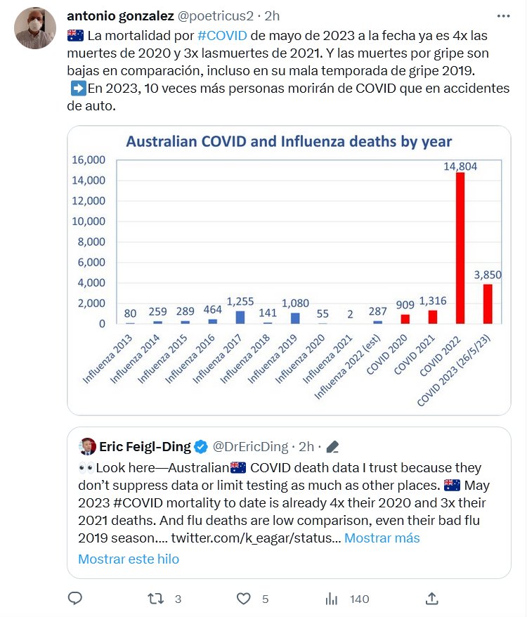 🇦🇺 La mortalidad por #COVID de mayo de 2023 a la fecha ya es 4x las muertes de 2020 y 3x lasmuertes de 2021. Y las muertes por gripe son bajas en comparación, incluso en su mala temporada de gripe 2019. ➡️En 2023, 10 veces más personas morirán de COVID que en accidentes de auto.