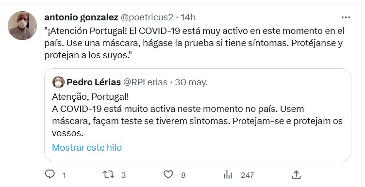 PERO, SEGURO, SEGURO, SEGURO QUE LA PANDEMIA TERMINÓ? «¡Atención Portugal! El COVID-19 está muy activo en este momento en el país. Use una máscara, hágase la prueba si tiene síntomas. Protéjanse y protejan a los suyos.»