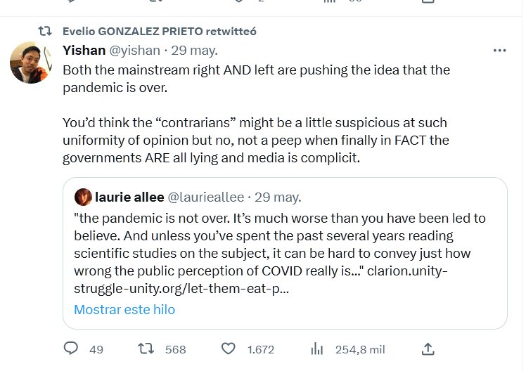 PESTE DERECHA AMBIDIESTRA (EN INGLÉS) Tanto la derecha como la izquierda dominantes están impulsando la idea de que la pandemia ha terminado. Uno pensaría que los «contrarios» podrían sospechar un poco ante tal uniformidad de opinión, pero no, ni un ápice cuando finalmente, DE HECHO, todos los gobiernos ESTÁN mintiendo y los medios de comunicación son cómplices.