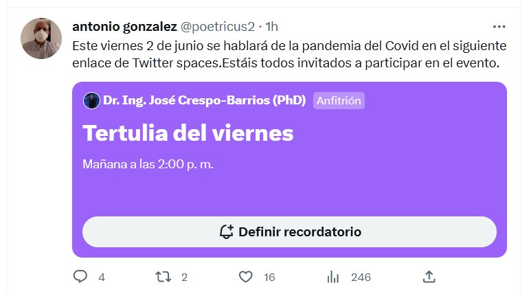 Este viernes 2 de junio se hablará de la pandemia del Covid en el siguiente enlace de Twitter spaces.Estáis todos invitados a participar en el evento. Posted on junio 1, 2023 por coronado https://twitter.com/poetricus2/status/1664263793730367490