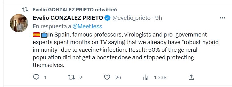 MALA PRAXIS (EN INGLÉS) 🇪🇸📺En España, célebres profesores, virólogos y expertos oficialistas pasaron meses en la televisión diciendo que ya tenemos una «inmunidad híbrida robusta» por vacuna+infección. Resultado: el 50% de la población general no recibió una dosis de refuerzo y dejó de protegerse.