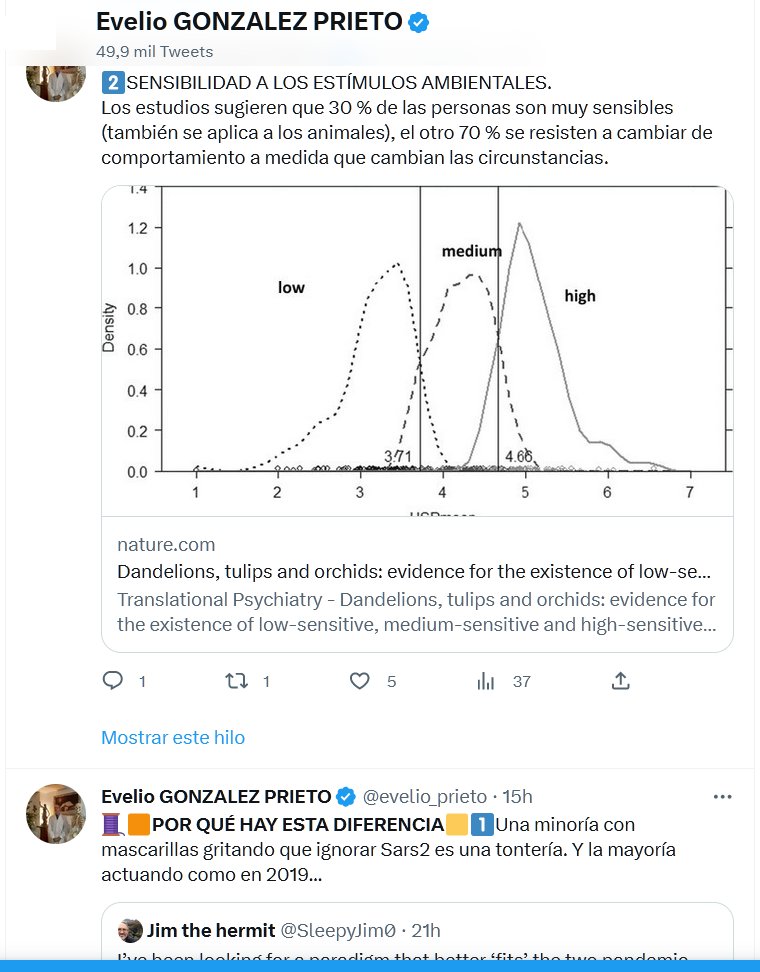 🟧POR QUÉ HAY ESTA DIFERENCIA🟨1⃣Una minoría con mascarillas gritando que ignorar Sars2 es una tontería. Y la mayoría actuando como en 2019… SENSIBILIDAD A LOS ESTÍMULOS AMBIENTALES. Los estudios sugieren que 30 % de las personas son muy sensibles (también se aplica a los animales), el otro 70 % se resisten a cambiar de comportamiento a medida que cambian las circunstancias.