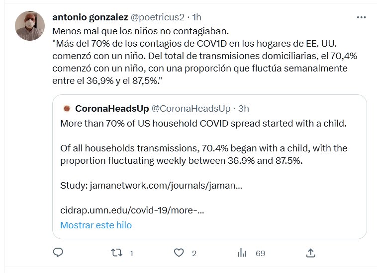 CRIMEN ORGANIZADO Menos mal que los niños no contagiaban. «Más del 70% de los contagios de COV1D en los hogares de EE. UU. comenzó con un niño. Del total de transmisiones domiciliarias, el 70,4% comenzó con un niño, con una proporción que fluctúa semanalmente entre el 36,9% y el 87,5%.»