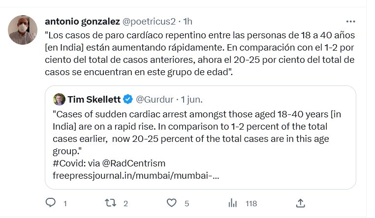 «NOCOVID» Y POSTCOVID HACEN ESTRAGOS «Los casos de paro cardíaco repentino entre las personas de 18 a 40 años [en India] están aumentando rápidamente. En comparación con el 1-2 por ciento del total de casos anteriores, ahora el 20-25 por ciento del total de casos se encuentran en este grupo de edad».